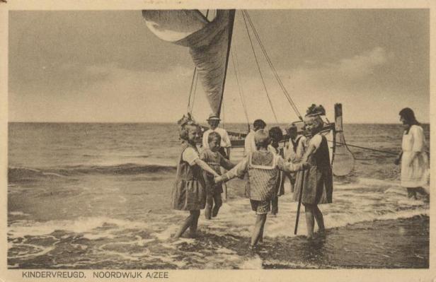 Het is mij niet helemaal helder wat voor soort van ‘kindervreugd’ hier wordt uitgebeeld. Een beetje in de rondte springen onder het kwelen van een liedje? “Zakdoekje leggen, niemand zeggen?” De zakdoek zou doornat door de stroom van het aanstormende of terugtrekkende water worden meegenomen. Verheugden de kids zich op een tochtje met de boot? Of poseerden zij alleen maar een beetje ‘leuk’ voor de foto?