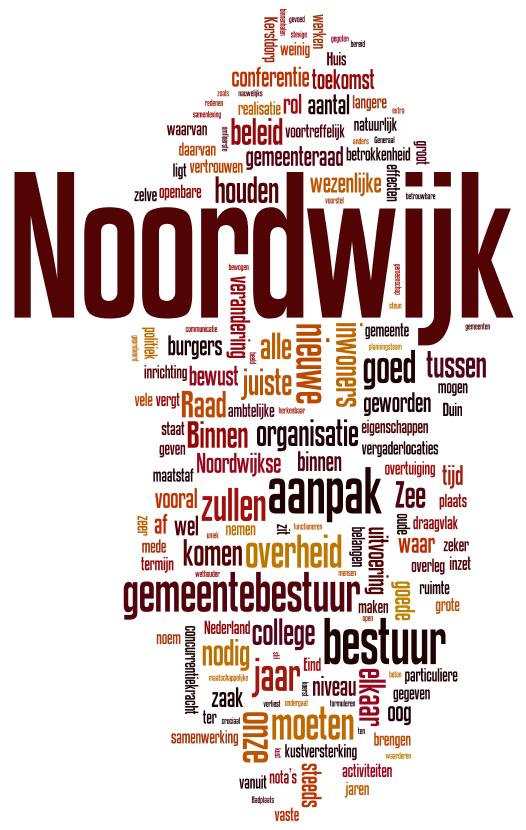 Burgemeester Harry Groen van Noordwijk hield in januari 2008 een nieuwjaarstoespraak, die met behulp van dat geweldige programmaatje wordle gemakkelijk te analyseren is op hoofdlijnen: veel bestuurlijke aangelegenheden, Noordwijk als Walhalla voor vergader- en conferentievoorzieningen. Concurrentiekracht, Kerstdorp en Kustversterking. Binnen en Zee. En door de hele toespraak heen: NOORDWIJK.
