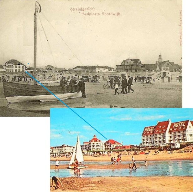 Aan beide uiteinden van de blauwe streep bevindt zich ‘De Poolstar’ en wat me nu opvalt is dat die er eerder stond dan het Palace Hotel. Verder is het ongeveer dezelfde plek, maar er zitten tijden en werelden van verschil tussen.