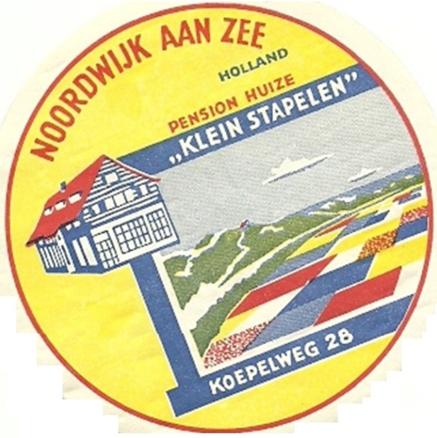 Het lijkt op een bierviltje, maar het was een kofferlabel of een reissticker. Niet alle hotels en pensions in Noordwijk hadden er één. Pension Klein-Stapelen wel. En een hele mooie.
