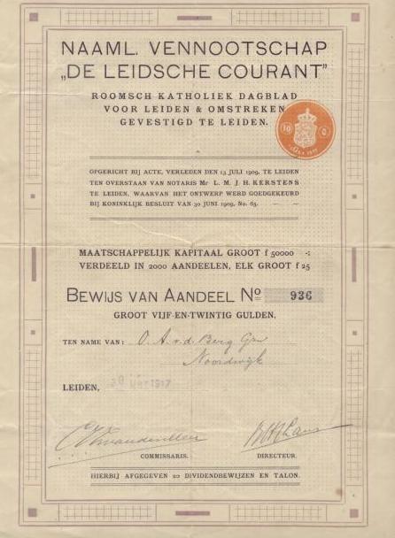 Op het aandeel de handtekening van C.J.L. van der Meer, broer van mijn grootvader, van de oprichting in 1909 tot zijn dood in april 1927 president commissaris (en medeoprichter) van de Leidsche Courant). Zie ook Leidsche Courant van 26 april 1927.