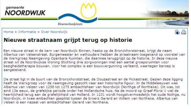 Er is een officieel persbericht van de gemeente Noordwijk over de naamgeving van een nieuw straatje. Het gaat om de Albertus van Velzenstraat en dan volgt met gevoel voor historie de nodige tekst en uitleg over deze Albertus van Velzen. Maar de historie lijkt me een beetje onvolledig, als ik het allemaal zo lees. Het gaat om twee zinnen, waar iets is weggelaten: