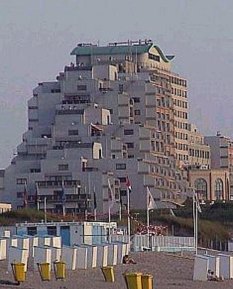 Ik kan niet nagaan wie de foto heeft gemaakt, maar hij toont het Nieuwe Huis ter Duin met al zijn spierballen. Een onverzettelijke massa steen, hoog op de duin, storm en water trotserend. Dat is de bedoeling. Maar op deze foto lijkt er dwars door alle gebouwen ook een kronkel te bewegen. Alsof er net een aardbeving doorheen is gegaan.