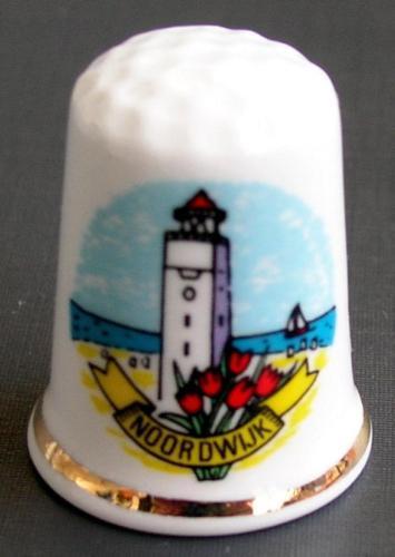 Tot zo ver de Wikipedia. Ik weet dat mijn moeder wel een vingerhoed had, vroeger, gewoon eentje van koper of messing. Maar niet ééntje van porselein, zoals deze, met dat malle stempel ‘Noordwijk’ erop. Er was helemaal niemand in Noordwijk die vroeger met zo’n ding op de vinger aan het borduren , verstellen of kousen stoppen ging.