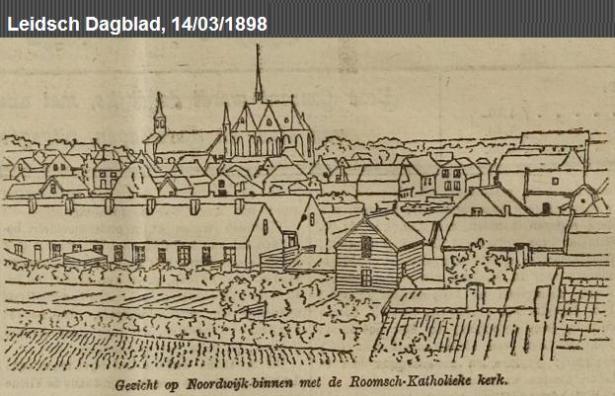 Wie de tekening heeft gemaakt, stond er niet bij in het Leids Dagblad van 14 maart 1898. Wat je ziet is de katholieke kerk die in ombouw is van een klein waterstaatskerkje naar een groots en meeslepend neo-gothisch bouwwerk. En je ziet een heleboel huizen, maar ik kan nog niet precies determineren welke dat zijn. Die twee rijen huizen links op de voorgrond: de Molensteeg (alias ‘De Keuvel’)?