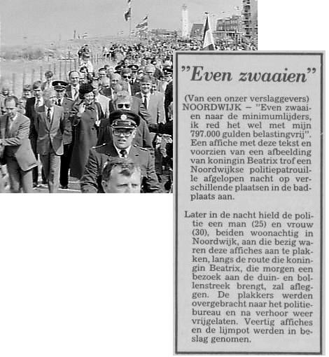 Maar ze had geen weet van een anoniem gebleven Noordwijks stel, dat daags tevoren het oude dorp had afgestroopt en overal ketterse affiches had aangeplakt. “Even zwaaien naar de minimumlijders, ik red het wel met mijn 797.000 gulden belastingvrij.” stond er op.
