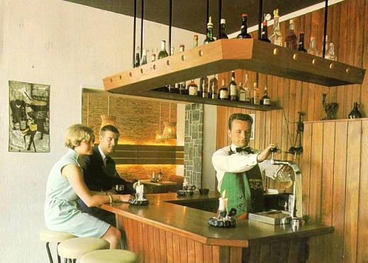 Het bijschrift bij de foto luidt dat het hier om de bar van het Palace Hotel in Noordwijk gaat. Het ‘oude’ Palace Hotel wel te verstaan, want we schrijven 1968 en dat kun je wel zien ook. Het macraméschilderij aan de wand, de onovertroffen schrootjes tegen bar en muren, de lampenkappen van pitriet, een quasi-antiek stuk tegelwerk, het keurig gekapte, waarschijnlijk enigszins gepommeerde haar van de barkeeper.