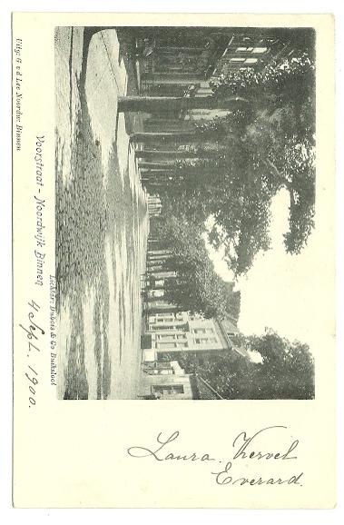 Laura Kervel-Everard woonde met man en kinderen aan de Voorstraat 48a in Noordwijk-Binnen en dat moet op deze foto ergens aan de linkerkant geweest zijn. Ik vermoed dat ze de fotokaart een beetje gebruikte als visitekaartje met die mooie naam er zo mooi opgeschreven.