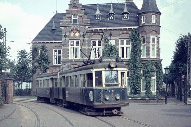 Op www.blauwetram.nl staan prachtige foto’s van het oude trambedrijf van de NZHTM. Ook deze: een tram op weg naar Noordwijk aan Zee slaat voor het gemeentehuis van Noordwijk links af. Als hij straks op het andere spoort weer terugkomt, is-tie op weg naar Den Haag. Dat weet-ie nu al (foto: J.H. Odendaal)