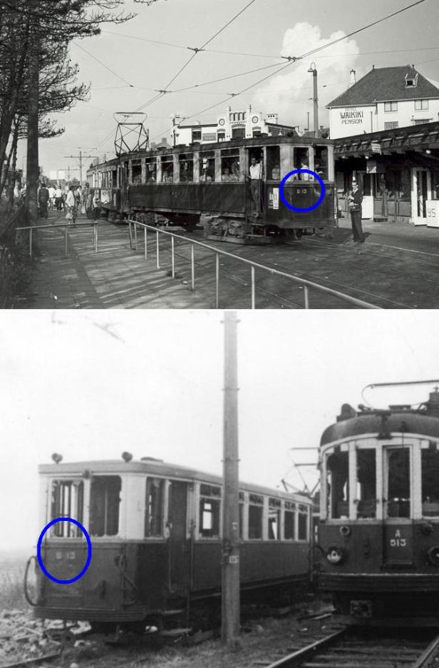 Twee beelden uit het leven van de B13, trouw aanhangwagen van de Blauwe Tram tussen Noordwijk en Den Haag.