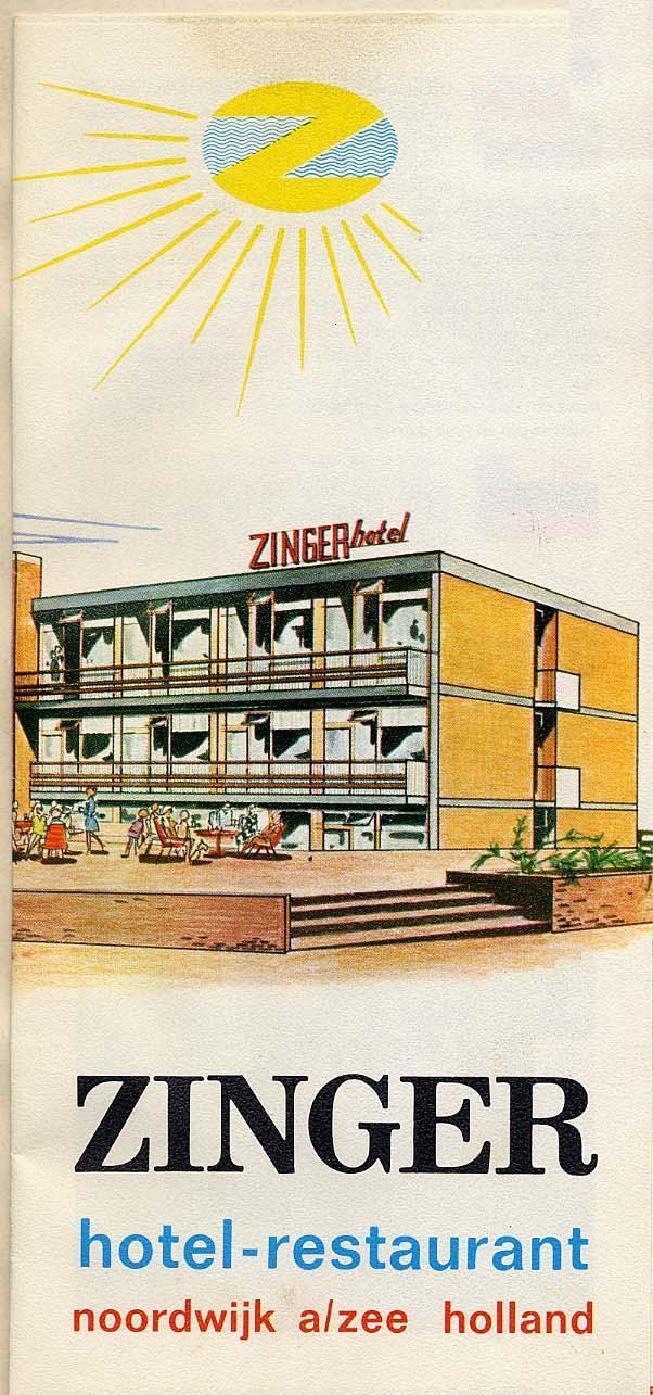 Over hotel Zinger hebben we het al wel eens eerder gehad. Ik krijg nu de omslag van de folder die door het hotel werd uitgegeven. Waarschijnlijk de beginfolder, toen het hotel er zelf nog niet stond. Geen foto, alleen een ‘artists impression’, wervend, hengelend naar de eerste gasten.
