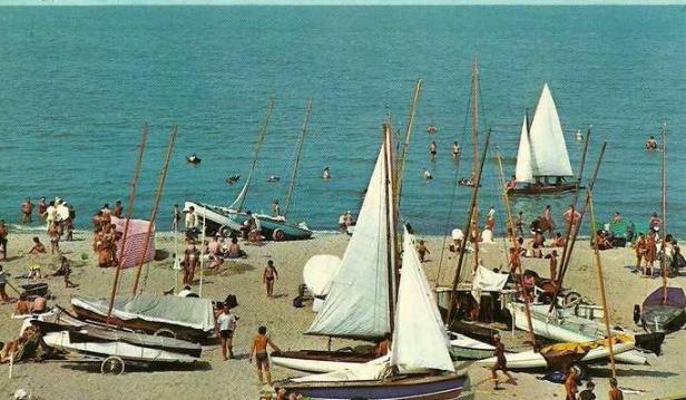 Het was altijd een gezellige chaos op het stukje strand waar de Zeilvereniging Noordwijk haar boten had liggen. Alles schots en scheef door elkaar. Badgasten en autochtonen vrolijk standkamperend tussen de boten in.