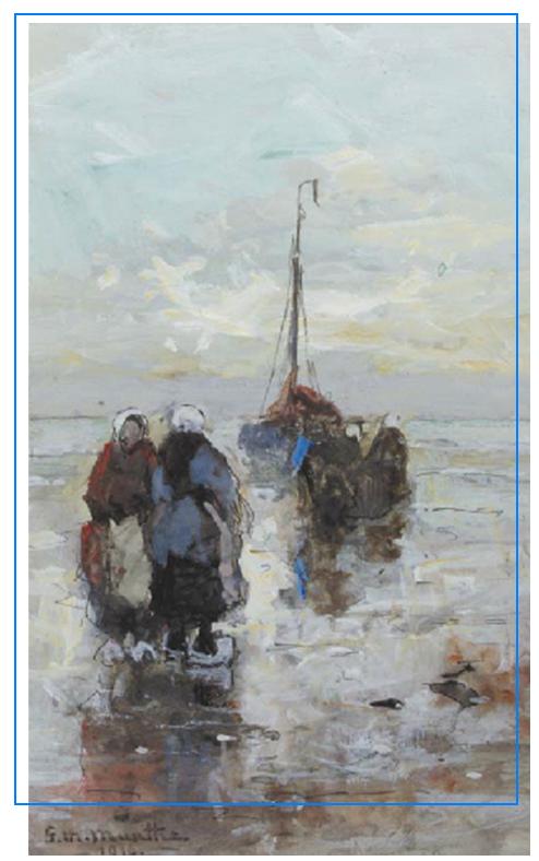 Dit schilderij is getiteld “Vissersvrouwen op het Strand van Katwijk”. Op de achterkant is een label geplakt met daarop: “In herinnering aan de aangename kennismaking Zomer 1916 te Noordwijk aan Zee. G.Morgenstjerne Munthe / Thea M.Munthe”.