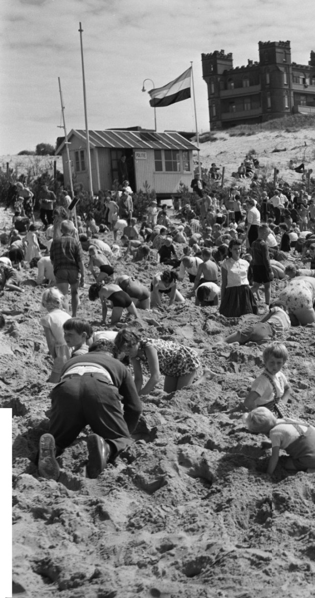 Maar in Noordwijk weten wij wel beter: hier is sprake van een ouderwets Noordwijkse schatgraverij, jaarlijks georganiseerd door de Noordwijkse (strand-) politie voor het goede doel. Je moest met je blote handen graven en wij kinderen deden dat met het fanatisme van een op hol geslagen duinkonijn. Er lagen allemaal busjes in het zand, kleine prijsjes. Maar in één busje zat een grotere prijs. Vijfentwintig gulden of zo.