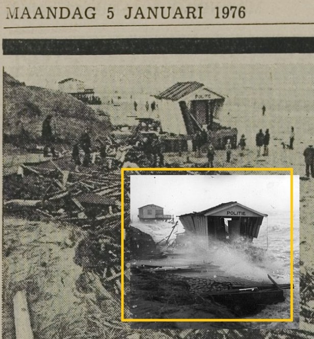 De een denkt dat het in 73 of 74 gebeurde. Zeebad stond er met zijn neus bovenop en zag de boel aan de zeezijde worden ingedrukt, waarna het dak in de golven zou zijn verdwenen. En iedereen zou erbij gestaan hebben. Ik stond er ook, althans dat herinner ik mij, maar herinneringen zijn niet feilloos.