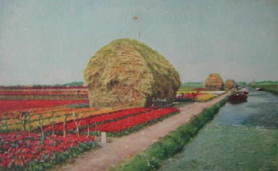 Ik geloof niet dat deze ingekleurde foto per se in Noordwijk geschoten is, maar het beeld zou daar zeker niet misstaan. Alle bollenboeren hadden vroeger dit soort van hooibergen. Ik had een oom die sprak van ‘hooibargen’, maar meestal werden ze ‘rietschelven’ genoemd.