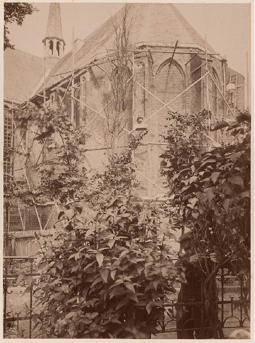 Dit zinderend mooie “Gezicht op de N.H. Kerk van Noordwijk-Binnen” wordt toegeschreven aan ene A.J.M. Mulder. De foto is gedateerd op juli 1901 en blijkbaar moest er juist op dat moment het één en ander verhapstukt worden aan de buitenkant van de kerk. De man met zijn handen om het boompje in de tuin van het gemeentehuis.