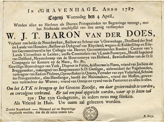 Dit stuk betreft een uitnodiging, zo niet een schotschrift voor de begrafenis van Wigbold Johan Theodoor baron van der Does, heer van de beide Noordwijken. We schrijven 1787 en patriotten uit Leiden nemen de gelegenheid te baat om de orangist Van der Does eens flink te grazen te nemen. En dat gaat niet zachtzinnig: Van der Does – een nazaat toch van de grote Dousa, orangist maar ook Bevrijder van Leiden bij het Ontzet van 1574 – wordt hier uitgemaakt voor alles wat niet mooi en lelijk is: "uitbroeidzel der Vagebonden, (…), verrader van zyn Vaderland, Schuim der Prinsgezinden (…) en vriend der Moffen (toen al een belediging blijkbaar)."