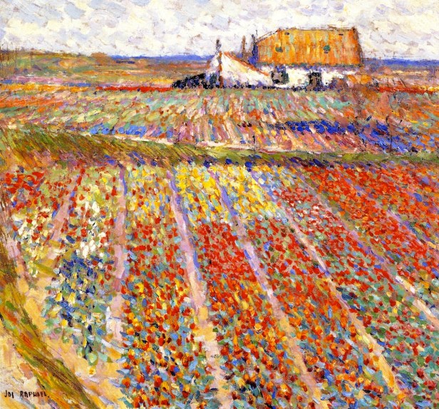 Vanuit Oegstgeest maakte hij graag uitsapjes naar de bollenvelden en het strand in Noordwijk. Dit schilderij “Tulip Fields at Noordwijk” dateert van ongeveer 1912. Klik op de afbeelding: de kleuren zijn duizelingwekkend.