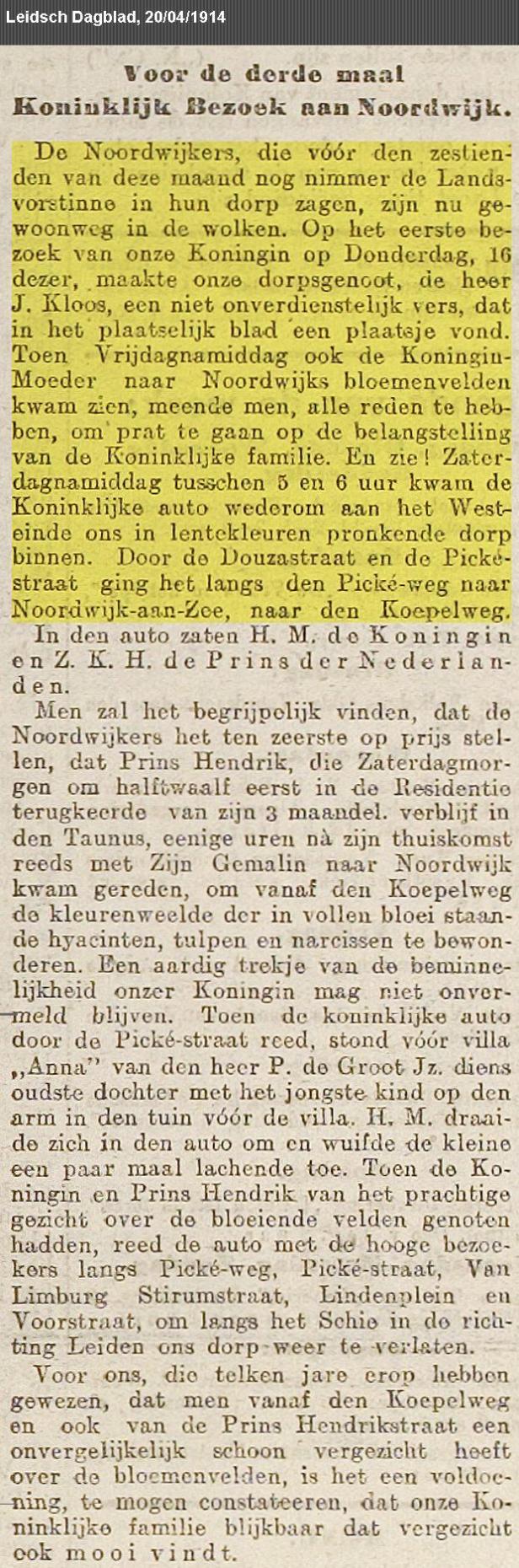 Naar verluidt was ze van haar leven nog nooit in Noordwijk geweest, maar op 16 april 1914 liep ze doodgemoedereerd en onaangekondigd langs de Oude Zeeweg naar de Noord-Boulevard en vandaar weer naar de Koepelweg. Van daaraf bekeek ze de bloeiende bollenvelden en blijkbaar maakten die zoveel indruk dat ze een dag later met koningin-moeder Emma terugkeerde en op zaterdag nog eens een keer met eega Prins Hendrik. Volgens de krant schreef J. Kloos al bij de eerste gelegenheid ‘een niet onverdienstelijk vers’ (dat dus wel tenenkrommend geweest zal zijn), maar toen moest ze dus nog twee keer terugkomen.