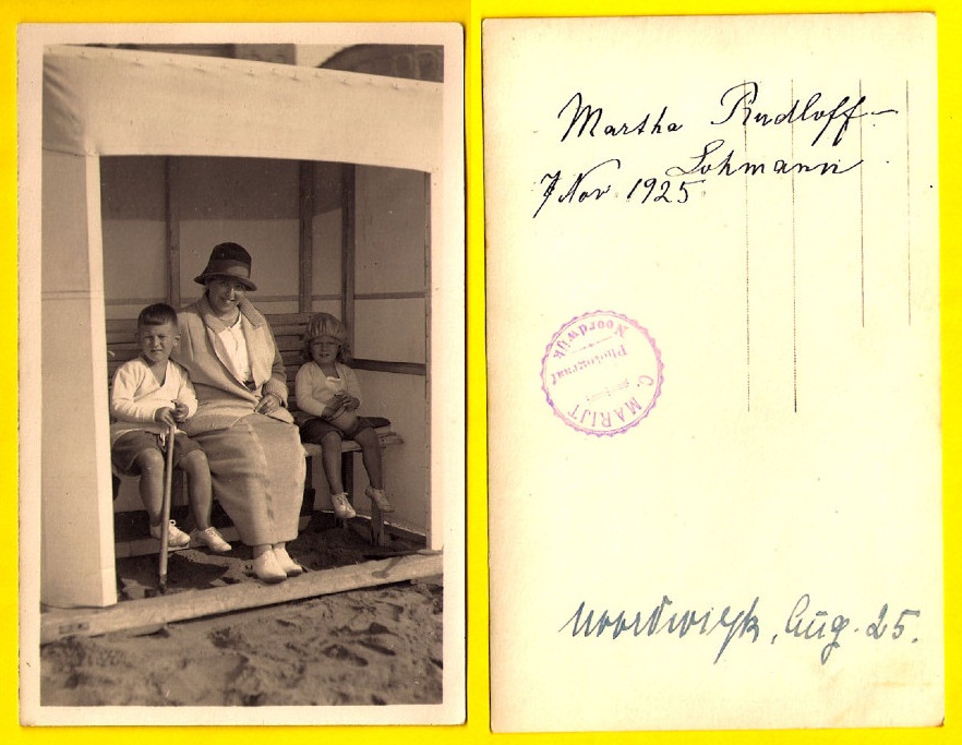 Ze heette Martha Rudloff-Lohmann. Ze kwam ongetwijfeld ergens uit Duitsland en liet zich in augustus 1925 met (haar?) twee kinderen fotograferen op het strand van Noordwijk. C.Marijt was de fotograaf. Die struinde blijkbaar ‘s zomers de stranden af om snapshots zoals deze te nemen. Geen vetpot, want blijkens berichten in de Leidse couranten kregen dat jaar naast Marijt ook Van Kampen en Van der Steen een vergunning om op het strand hun fotohandel te drijven.