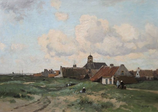 Nota Bene: Ik krijg van Li-st een mooie verwijzing naar een website over Westlandse schilders. Curieus genoeg wordt Marinus Gidding blijkbaar tot de Westlanders gerekend, terwijl hij in Rotterdam geboren was en – blijkens de genoemde site – grotendeels in Loosduinen werkte. Nu is Loosduinen gelegen op de grens van Den Haag en het Westland, maar het is eerder Den Haag dan Westland (hoop ik, want ik woon er zelf). Enfin, op de ‘Westlandse’ site staat nog een ander werk van Gidding, ook van Noordwijk, bijna van dezelfde plek. Bijna. Hij was alleen klein stukkie meer naar links gaan zitten.