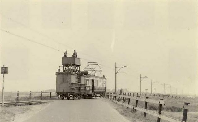 Een uitstapje naar Noordwijk was een verademing voor het ding, ook al moest-ie dan zo’n arremoeiige kar achter zich aantrekken met twee kerels op het dak die de bovenleiding afstoften. Maar goed: hij was er weer even uit. Morgen begon die weer in Oegstgeest en ging die richting de Hogewoerd in Leiden.