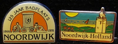 Het zijn twee zogenaamde speldjes, ‘pins’ in het Engels. Allebei tot meerdere eer en glorie van de badplaats Noordwijk. Speldjes als deze werden verzameld, op grote stukken schuimrubber werden ze meegesleept naar school en naar ruilbeurzen. Ongemakkelijk gedoe. Tegenwoordig worden ze niet meer verzameld, geloof ik. Ook nauwelijks nog gemaakt.