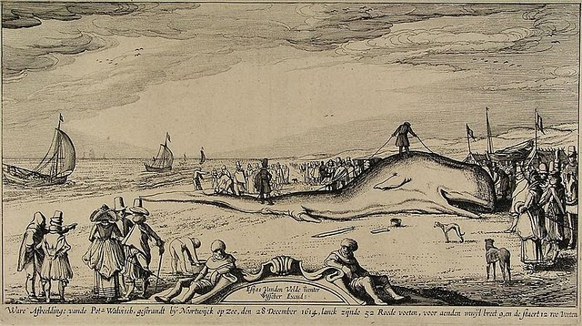 De ets van een gestrande potvis op het strand bij Noordwijk wordt toegeschreven aan Claes Jansz. Visscher (II) (1586–1652) en zou zijn gemaakt naar een schilderij van Esaias van de Velde. Het kunstwerk hangt op een volgens mij prachtige tentoonstelling in het Rijks in Amsterdam: “De Hollandse Wildernis: Duinlandschappen in de 17e eeuw”.