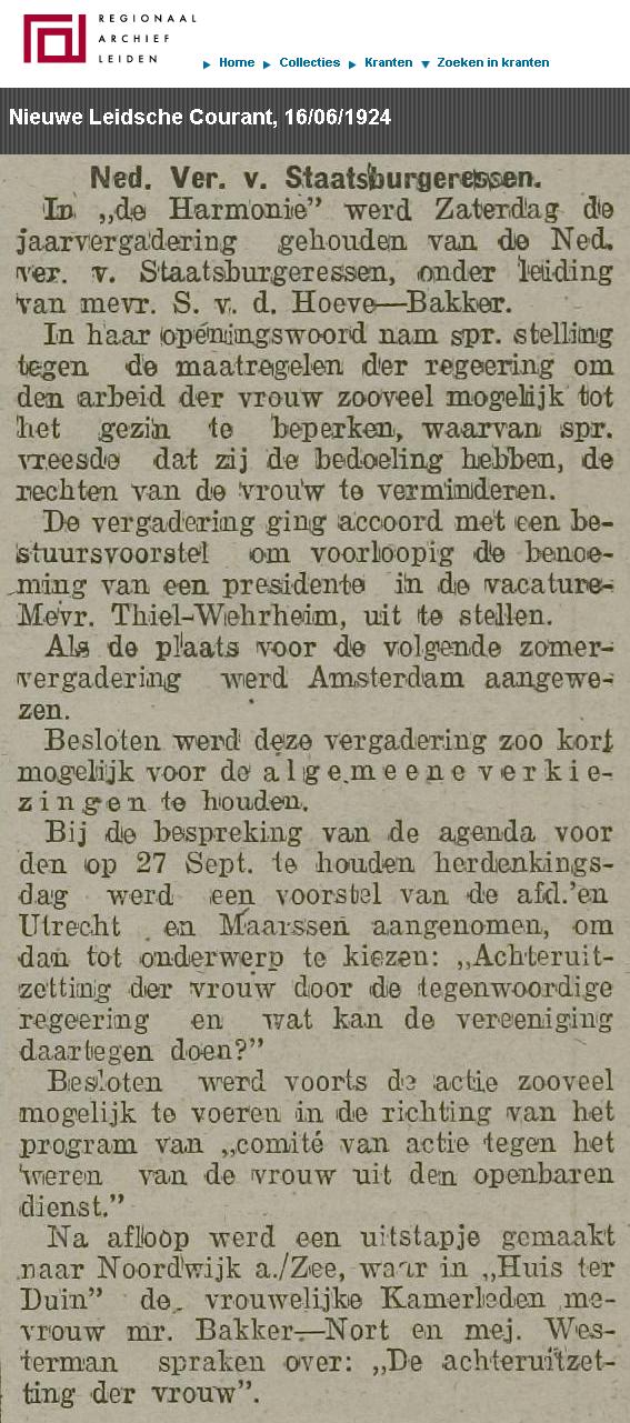 Op haar jaarvergadering van 1924 in Leiden waren het vooral lopende zaken die de Nederlandsche Vereeniging van Staatsburgeressen afhandelde, alvorens en masse naar Noordwijk te trekken voor lezingen van een tweetal, uiteraard vrouwelijke Kamerleden.