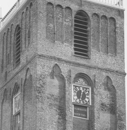 De wijzerplaten zijn op de foto nog relatief nieuw: 1881 staat erop. Op enig moment zijn die wijzerplaten vervangen. Waar zouden ze zijn gebleven?