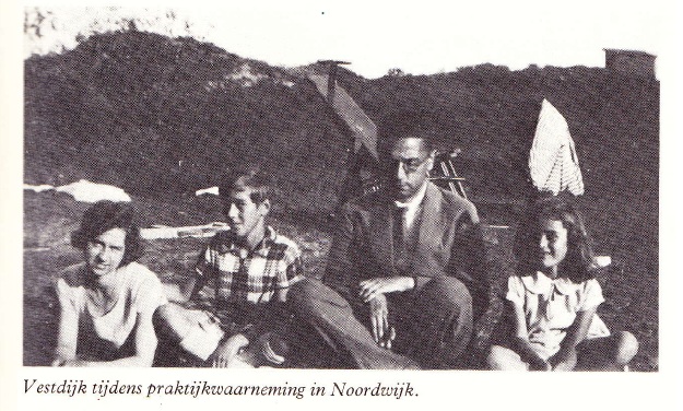 “Terug in Nederland (in 1928, na zijn voetreis door de Alpen) ging Vestdijk waarnemen in Noordwijk aan Zee. Een groot aantal foto’s, genomen in de tuin van een huis met wip en duinlandschap, herinnert hieraan; als datum wordt 28 september 1928 vermeld. Op alle foto’s zien we Vestdijk, met en zonder doktersjas, in Boeddha-houding of staande met de handen over elkaar samen met een jonge vrouw en twee kinderen – een jongen met een iets jonger zusje – soms met nog een tweede jongetje erbij. Gelet op het uiterlijk van de kinderen lijken de foto’s in twee opeenvolgende jaren genomen te zijn. Mogelijk heeft Vestdijk hier dus een tweede keer waargenomen. Aan de foto met Vestdijk in Boeddha-houding (de wip op de achtergrond) herinnert het gedicht “De Huisgenoot”, uit de serie ‘Portretten van Jeugdvrienden’, waarvan hier de eerste strofe:
