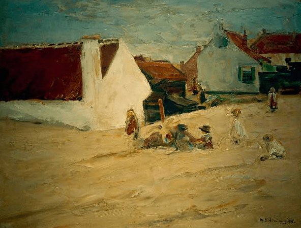“Bilder dieser Art machen veständlich, warum Max Liebermann zu Anfang des Jahrhunderts vielen als “Klassiker“ galt. Das Sujet ist denkbar einfach, die Malerei ist frei und in ihrer differenzierten Sparsamkeit beeindruckend. Im Vordergrund hockt eine Gruppe spielender Kinder im Sand der Dünen, die das Dorf von der See trennen. Im Hintergrund liegen die schlichten, weißgekalkten Häuser mit ihren roten Ziegeldächern. Die dunkel gekleideten Kinder der Einheimischen mischen sich mit den hell angezogenen der Sommergäste. Das ist alles – obwohl man darüber viel erzählen könnte. Doch nicht bei Max Liebermann. Hier gibt es keine Geschichten, keine Anekdoten, eben nichts Besonderes. Das Verhältnis der Einheimischen und der Fremden zueinander ist ein malerisches. Eben deshalb handelt es sich dabei um ein großartiges Bild.”