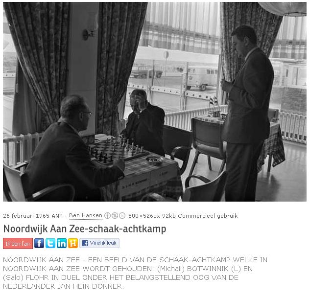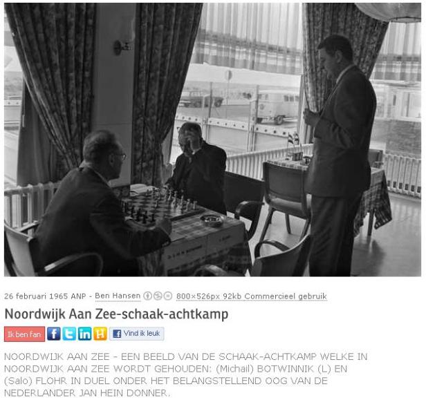 Het is een ANP-foto en -bericht van 26 februari 1965. De grootmeesters Botwinnik en Flohr bestrijden elkaar onder het toeziend oog van grootmeester Jan Hein Donner. Het is het Daniël Noteboomtoernooi dat gespeeld werd in het Palace Hotel in Noordwijk. Echt rustig moeten de heren niet gezeten hebben met alle voorbijkomend verkeer op de boulevard. Maar ze deden hun best.