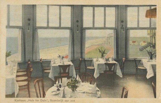 Is het nu een schilderstuk of een ingekleurde foto? Moeilijk te zeggen. Het is de eetzaal van Huis ter Duin in Noordwijk ergens vóór de Tweede Wereldoorlog. Wat het ook is, het is een mooi beeld, waarin je graag je ontbijt zou nuttigen. Verse sinasappelsap, een hardgekookt eitje met een beetje toast. Uitkijkend over strand en zee en jezelf niets anders meer toewenschend dan er de hele dag te kunnen blijven zitten.