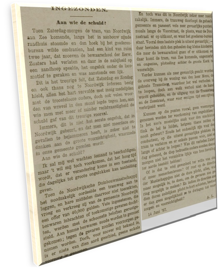 Amper twee jaar eerder was de eerste stoomtram Noordwijk binnengereden, maar in juni 1887 was er blijkens deze ingezonden brief nog steeds alle aanleiding voor burgers om hun beklag te doen over het ijzeren monster dat door hun straten ‘denderde’. Men kan het zich nu nauwelijks meer voorstellen, maar door toedoen van deze nieuwlichterij werden burgers ‘aanstonds lijken’ en werden hele rijtuigen ‘verbrijzeld’. Zo’n stoomtram kon waarschijnlijk niet veel harder dan 20 km per uur en begaf zich amechtig piepend en puffend over snerpende rails. En dan nog eiste een verontruste burger dat de conducteur op bepaalde punten stapvoets aan de tram vooraf zou gaan om onverstoorbare burgers en burgertjes te waarschuwen. Hoe dramatisch de dood van het kind ook was, het kan toch nauwelijks te wijten zijn geweest aan het ijzeren ding dat hier ‘langs het gemeentehuis in aanbouw’ strompelde.