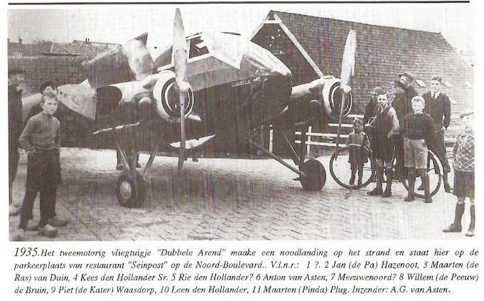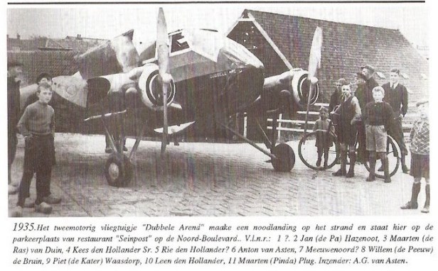 Het bijschrift uit ‘De Blauwdotter’, onvergankelijke periodiek van het Genootschap Oud-Noordwijk, vermeldt dat het in 1935 was, maar dat klopt niet. De ‘Dubbele Arend’ maakte zijn noodlanding op het strand op 8 mei 1937. Het ding was eigendom van ene Van Melle, directeur van de gelijknamige toffee- en suikerwarenfabriek in Breskens, Zeeland. De Blauwdotter vermeldt ook niet dat het hier om een General Aircraft Monospar ging, en type vliegtuig dat in gespecialiseerde kring wel enige faam genoot.