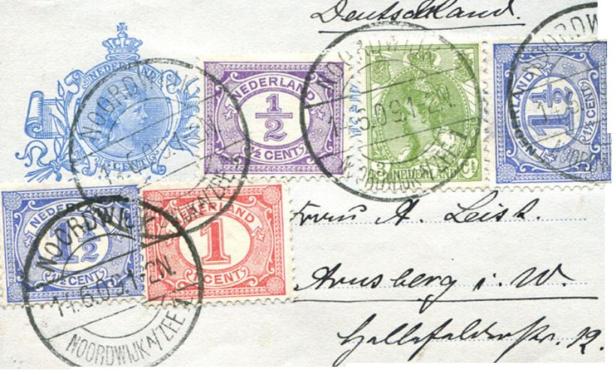 De kaart is prachtig behangen met verschillende postzegels in prachtige kleuren. Afgestempeld op 14 juni 1909 tussen 1 en 2 ’s middags in Noordwijk Binnen of in Noordwijk Zee. Maar waar die naar toe ging, mag Joost weten. De plaatsnaam is wat mij betreft onleesbaar. De naam van de aangeschrevene trouwens ook.