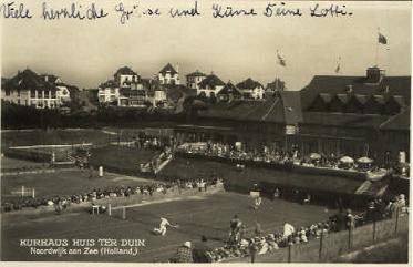 Het is een foto van de Casino-tennisbanen, maar er staat Huis ter Duin onder. Tsja. Het is ook saai werken op zo’n ansichtkaartenfabriek. Je krijgt een foto en je moet er met loodletters nog een tekst inschrijven zonder dat je enig benul hebt – of bijna geen benul – van de afbeelding die voor je ligt. Je bent wel eens in Noordwijk geweest en je weet van het Casino en van het Huis ter Duin en je denkt: dat is toch allemaal één pot nat. Of je denkt: het is goedkoper om één foto uit te geven van 2 verschillende plekken, dat bespaart me weer een paar centen. Dus doe je dat. En die alleraardigste Lotti die een kaart naar de Heimat wil sturen – mit viele herzliche Grüsse und Küsse – die Lotti heeft het toch niet door. Denk je.