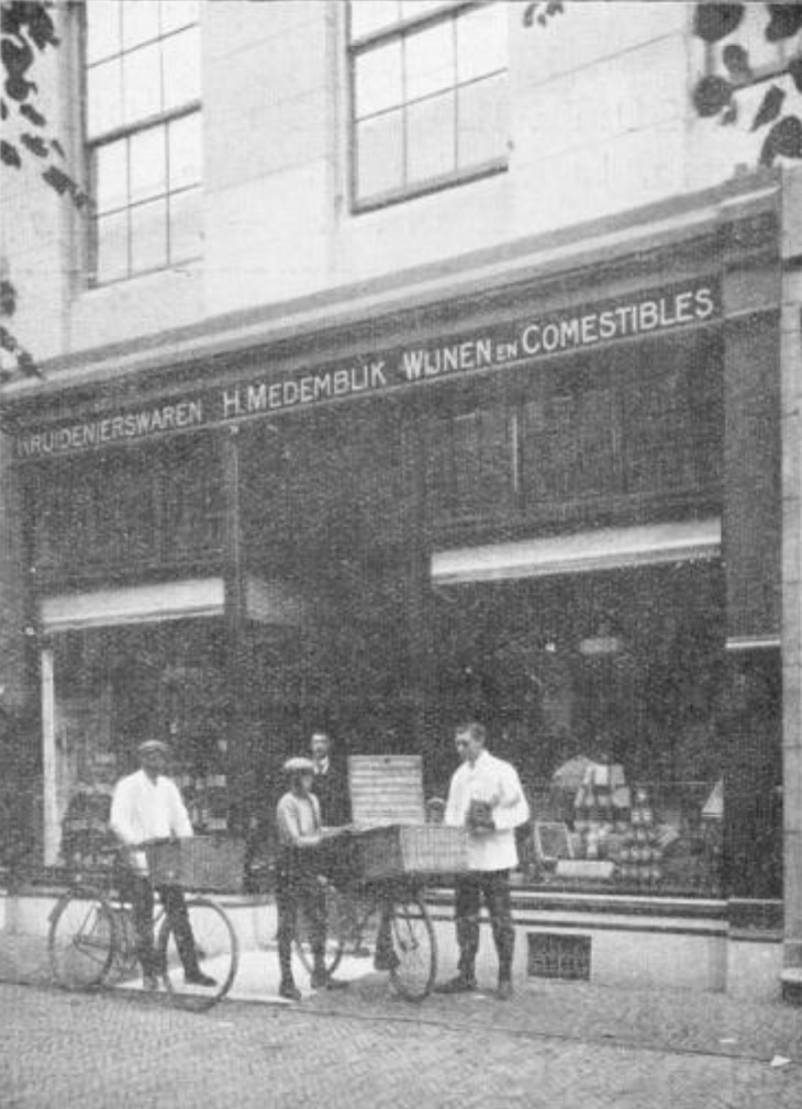 Ik heb zelf nog wel meegemaakt dat Medemblik hier zijn nering voerde, al was alles misschien toen al een betje op zijn retour. Hier op de foto nog niet: Medemblik zelf in de deuropening en 3 (drie!) knechten ervoor.