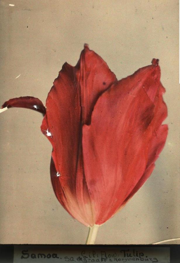 Op de onuitputtelijk mooie en rijke site van Spaarnestadfoto komen we een hele reeks van tulpenfoto’s tegen, gemaakt rond 1927 door Leendert Blok, een in specialistische kring vermaarde fotograaf. Zijn tulpenreeks is een voorbeeld van vroege kleurenfotografie volgens het zogenoemde autochroomprocédé. Dat procédé wordt op genoemde site als volgt omschreven: “Met behulp van oranje, violet en groen gekleurde zeer fijne aardappelzetmeelkorrels welke als een filter werken en die op een zwart-wit positief op glas zijn aangebracht, ontstaat een beeld dat als een kleurendia bekeken kan worden.” Het effect is overdonderend mooi. Zo mooi dat afdrukken ervan nog steeds worden verkocht.