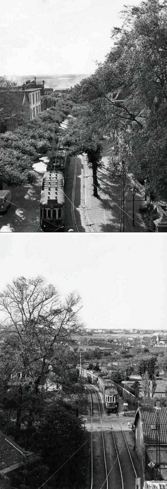 De fotograaf zat op het dak van het gemeentehuis en hij hoefde niet zo veel moeite te doen om deze twee foto’s te maken. Gewoon een beetje meedraaien met de route van de tram, alle tijd om aan te leggen en af te drukken.