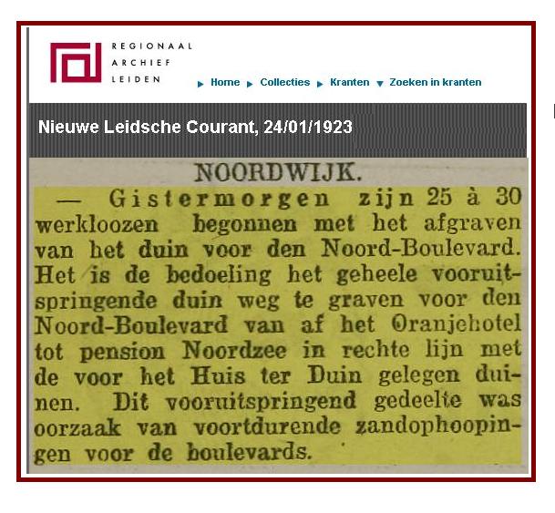 Het bericht is al van 1923, maar heeft 88 jaar na dato nog steeds een hoge actualiteitswaarde. Blijkbaar stoorde men zich toen ook al aan voortdurend optredende ‘zandophoopingen’ en nu is het niet anders: het Hoogheemraadschap Rijnland heeft één grote zandophoping gecreëerd, ongeveer precies op dat gedeelte dat in 1923 nog door werklozen (!) werd weggegraven.