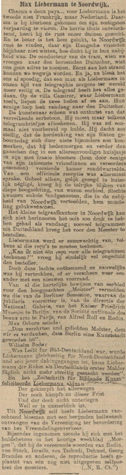 Het bericht in de krant spreekt voor zich. Alleen die ‘Villa Cassirer’: dat was de villa van de Berlijnse kunstverzamelaar en galeriehouder Paul Cassirer en diens vrouw, de actrice Tilla Durieux. Zij hadden een vakantiehuis laten bouwen dat later bekend werd als restaurant/ villa ‘Casa Mare’ aan de Noordboulevard in Noordwijk. Dáár vierde Max Liebermann zijn zestigste verjaardag. Over Paul Cassirer en Tilla Durieux vertel ik binnenkort weer een ander verhaal.