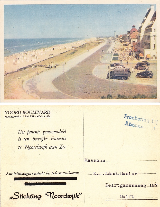 Noordwijk werd hier verkocht als een patent geneesmiddel. De kaart was aanvankelijk uitgegeven door de lokale VVV (dat lees ik nog door de zwarte streep heen), maar later blijkbaar door het informatiebureau van ‘de Stichting Noordwijk’ whatever dat nu weer was.