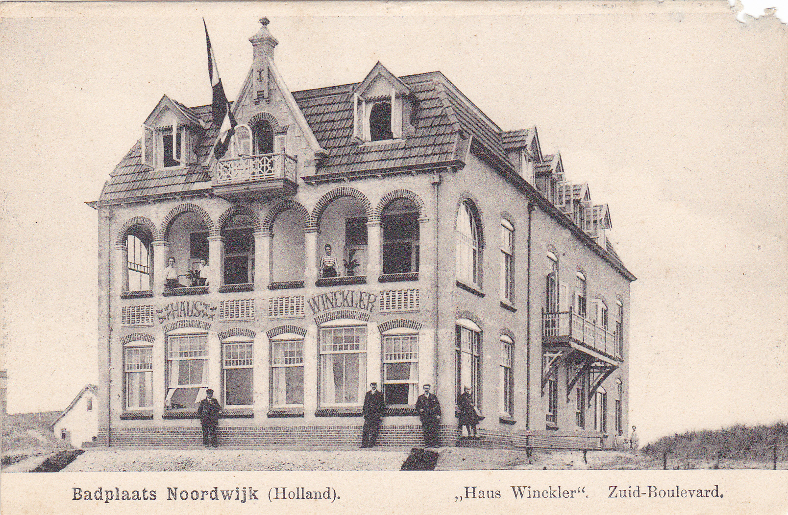 Op de onderste foto zijn we een stuk verder in de tijd. Haus Winckler wordt al een beetje weggedrukt door het aanpalende en pompeuzere Strandhotel. De loggia’s op de eerste verdieping zijn verdwenen om de kamers groter te maken, waarschijnlijk. En de prachtige letters ‘Haus Winckler’ zijn overgeschilderd en veranderd in ‘Pension Winckler’.
