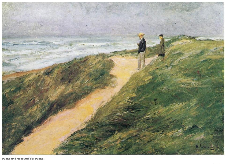 Die man en die vrouw op Düne und Meer (1909), die op een duintop over de woeste zee uitkijken: waar hebben ze het over? Waarom heeft die vrouw het hoofd gebogen, zoals de herderin van twintig jaar eerder, en waarom kijkt die man zo stuurs voor zich uit? Hebben ze ruzie? Zijn de woeste zee en de donkere wolken een metafoor voor hun leven? Of staan ze zich daar maar een beetje sloom te vervelen, omdat ze die dag niet kunnen zonnebaden? Het meest waarschijnlijk is dat Liebermann er zelf nooit over heeft nagedacht. Hij zag twee kleurig geklede mensen in het landschap, vond dat ze mooi in zijn schilderij pasten, en daarmee was het basta.