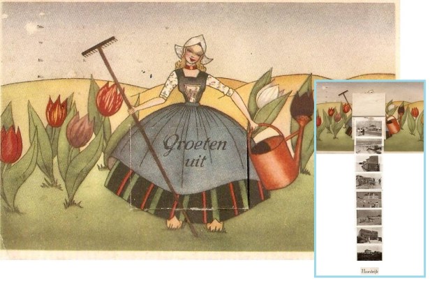 De beelden van Noordwijk waren verborgen onder het schort van een juffrouw die in de verste verte wel een Volendamse moest voorstellen (ofschoon Volendam helemaal drie keer niks met Noordwijk te maken heeft). De tulpen weer wel.