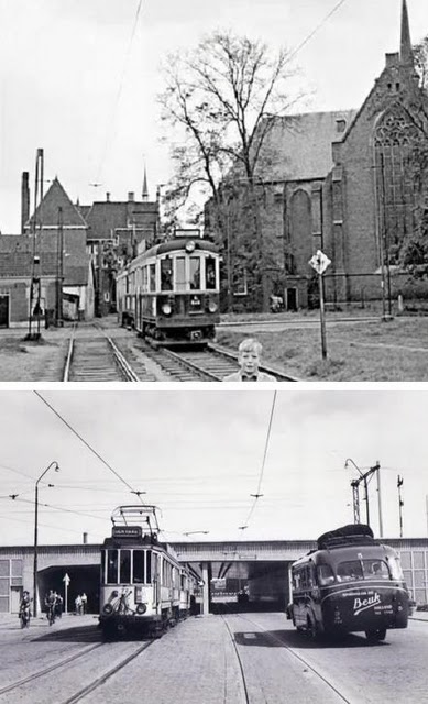 Op de bovenste foto zou je kunnen veronderstellen dat het jongetje met ware doodsverachting staat te poseren voor een naderende tram, Maar het valt mee: de tram gaat juist de andere kant op. Resteert de vraag wie dat jongetje nu precies was. Ik herken hem niet zo scherp, ofschoon hij van dezelfde generatie lijkt als ondergetekende.