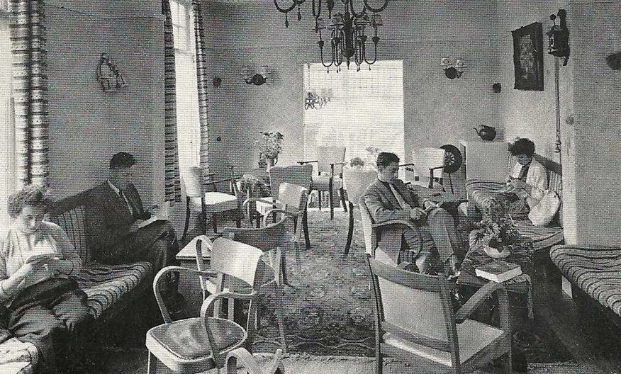 Hoe het vroeger was, daarvan getuigt dit plaatje. Een relatief goedkoop hotel (tal van verschillende soorten stoelen, een spinnewiel en een Zaanse klok aan de wand). Er wordt veel gelezen in weinig vakantionele kledij, één iemand borduurt of breit. Nog geen Pool te bekennen.